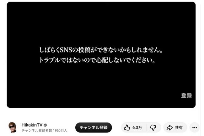ホーム>エンタメ>SNS>黒画面で長時間配信のHIKAKIN「心配しないで」メッセージに反響「休むのも大事」「ほんまに大丈夫?」 2026.03.29 黒画面で長時間配信のHIKAKIN「心配しないで」メッセージに反響「休むのも大事」「ほんまに大丈夫?」 著者: ENCOUNT編集部 タグ: HIKAKINXYouTubeヒカキン 【画像】真っ黒から変化したHIKAKINライブ配信画面のメッセージ ブレイク必至の若手俳優がついに手に入れた運転免許…憧れのアストンマーティン(JAF Mate Onlineへ) 【写真:YouTube(@HikakinTV)より】 この記事に戻るトップページに戻る 1 2 あなたの“気になる”を教えてください